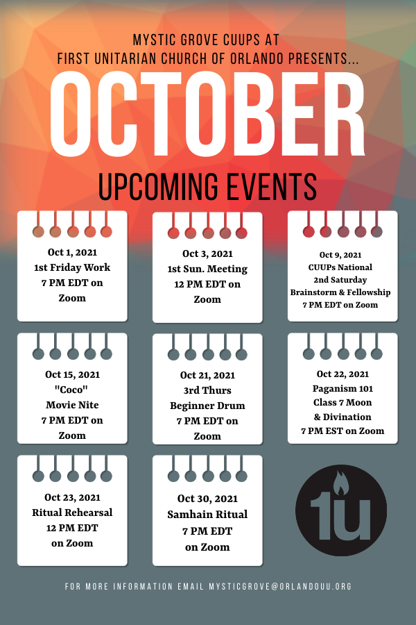 The Mystic Grove CUUPs October Monthly Events is posted. If you’d like the full annual calendar, you can find it at https://tinyurl.com/MGAnnualCalendar2021-2022 You can also keep up with us at https://www.facebook.com/mysticgrovecfl/events and at https://mysticgrovecfl.org/calendar/