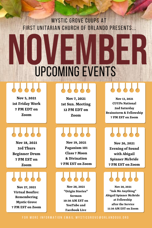 The Mystic Grove CUUPs November Monthly Events is posted. If you’d like the full annual calendar, you can find it at https://tinyurl.com/MGAnnualCalendar2021-2022 You can also keep up with us at https://www.facebook.com/mysticgrovecfl/events and at https://mysticgrovecfl.org/calendar/