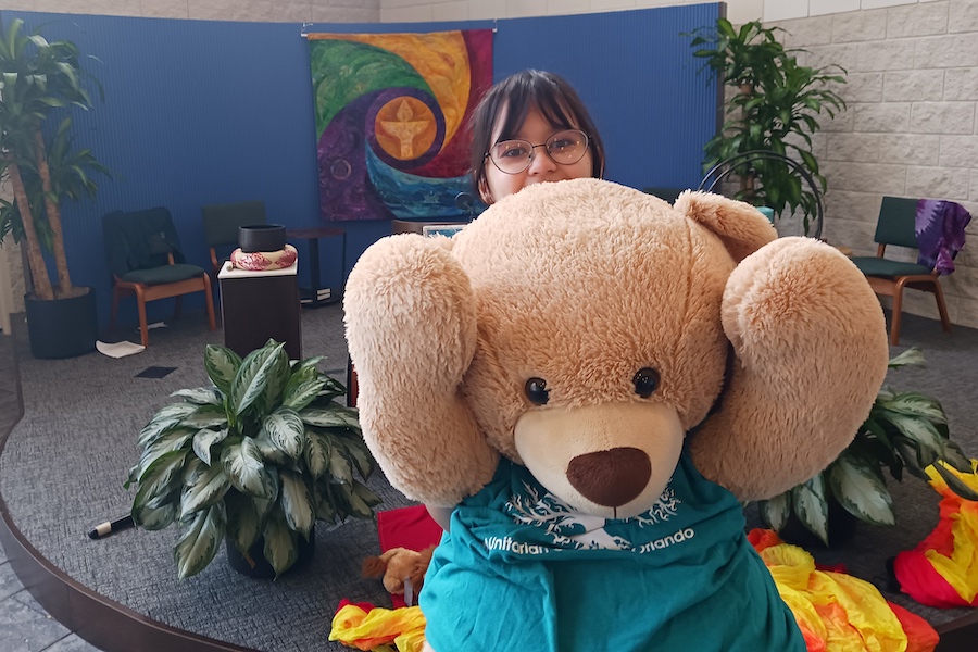 Bob (the Big Ol’ Bear) says thank you for helping him present the new “Element Chalice Quilt” by Peg Green in Time for All Ages on Sunday.