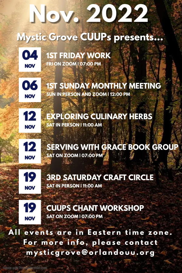 Mystic Grove CUUPs at First Unitarian Church of Orlando has posted the November 2022 Monthly Events. All events are in Eastern time zone.