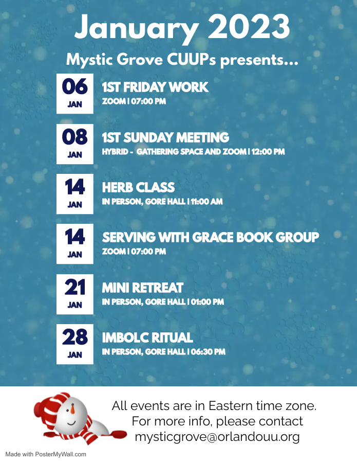 The Mystic Grove CUUPs January 2023 Monthly Events is posted.