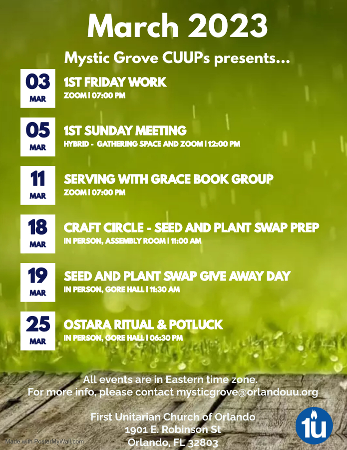 The Mystic Grove CUUPs March 2023 Monthly Events is posted.
