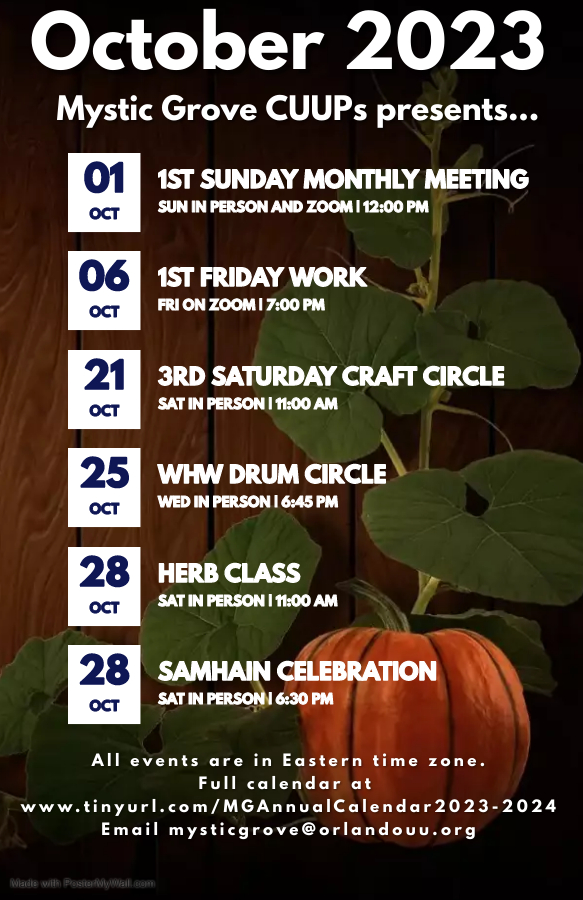 Mystic Grove CUUPs October 2023 Monthly Events is posted.All events are in Eastern time zone. Would you like a copy of the full year? Find it at https://tinyurl.com/MGAnnualCalendar2023-2024